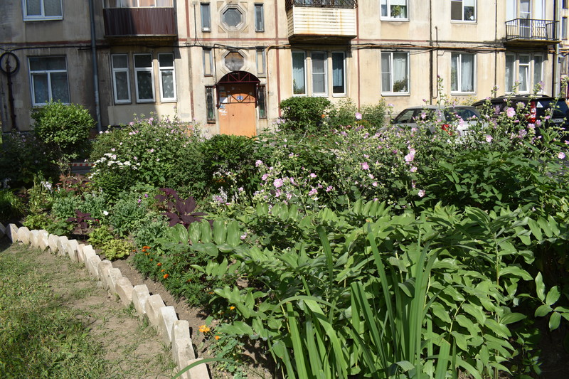 Глядя на красоту дома 82 на проспекте Победы, даже мысли не возникает о вандализме. Здесь убрали шины, сделали клумбы из подручных материалов для десятков видов растений, которые своим буйным цветением удивили жюри. Кроме того, у каждого подъезда появились цветочные кашпо.
