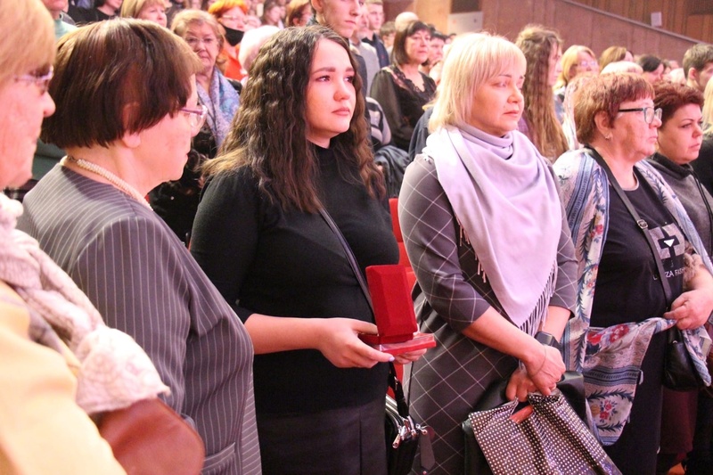 На мероприятии прозвучали слова благодарности, соболезнований и поддержки родным и близким героев. Жене погибшего защитника Отечества Артема Колесова передали боевые награды супруга — орден Мужества и медаль «За боевые заслуги».