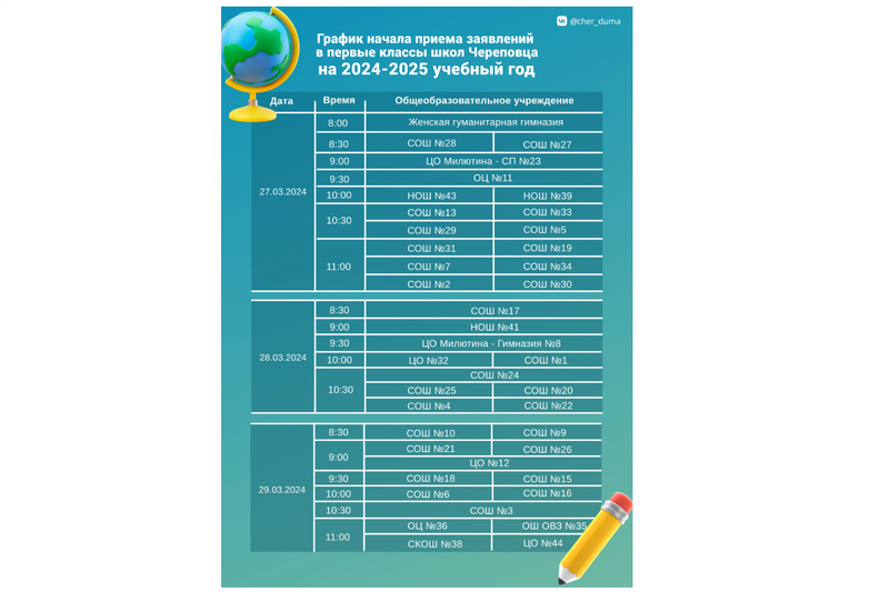 График приема заявлений в первые классы уже составлен и опубликован на личной странице мэра города Вадима Германова.
