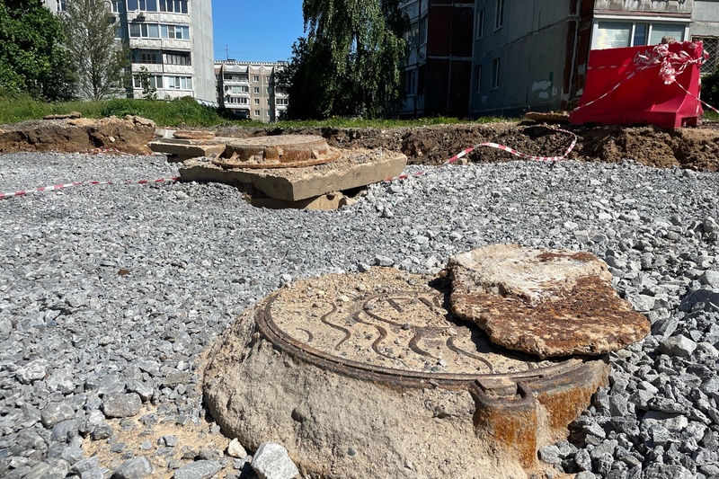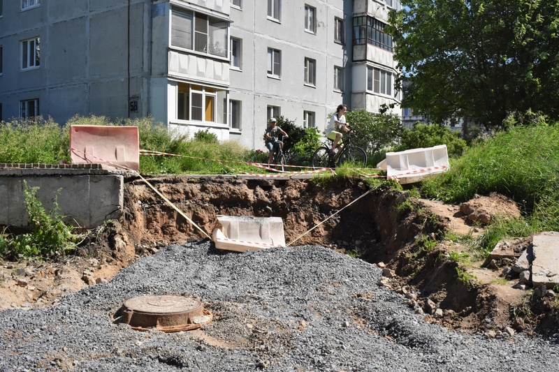 Одним из реконструированных участков в этом году стал проезд по адресу Октябрьский пр., 56. Сейчас рабочие сделали там выборку под тротуары и проезд, чтобы расширить площадь.