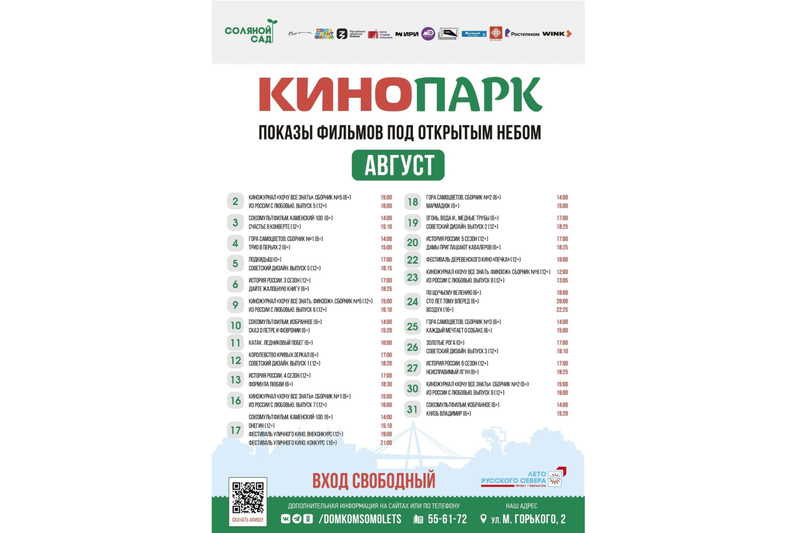 Кинопоказы проходят по проекту врио Губернатора Вологодской области Георгия Филимонова «Лето Русского Севера». Еще больше летних мероприятий области можно найти по кью-ар коду.