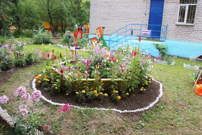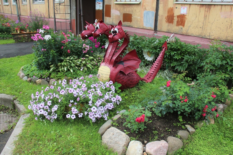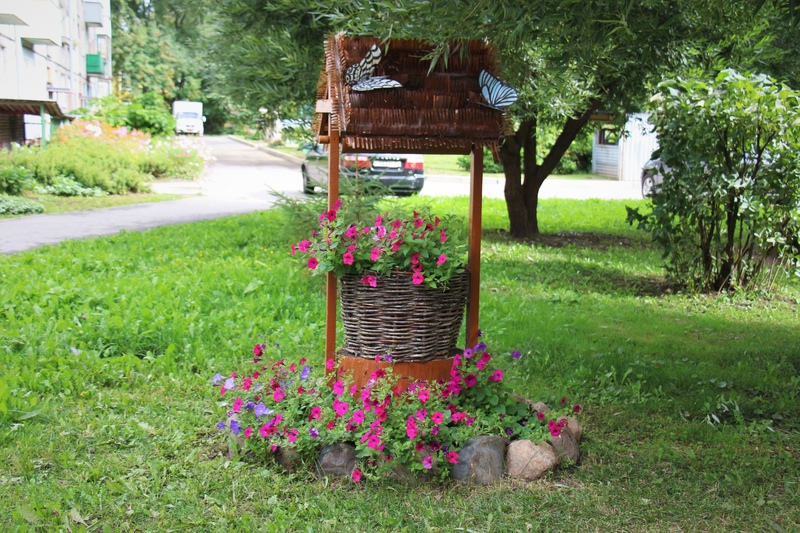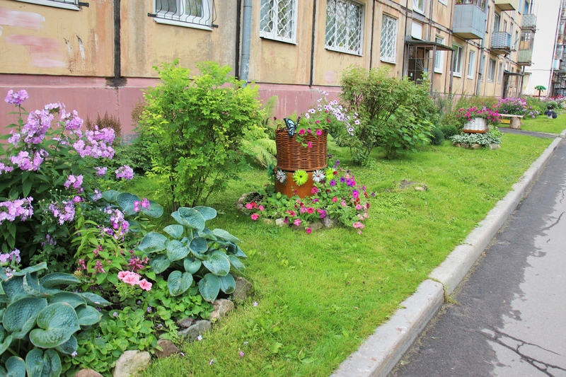 Гортензии, хризантемы и различные сорта петуний, хост и флоксов растут у подъезда многоквартирного дома. А дополняют цветочный ландшафт сказочные фигуры и плетенные корзины, сделанные своими руками.