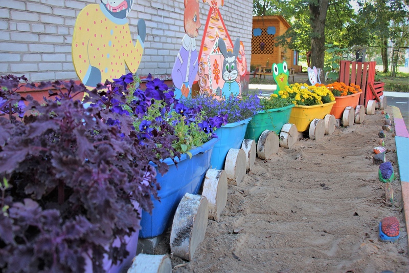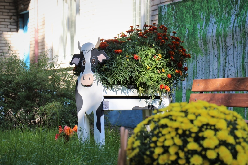На этом фантазия педагогов в озеленении территории сада не заканчивается. Еще одна интересная идея — «березовая роща», где выгуливают домашних животных. Коровы, свиньи, куры, кошки и собаки — цветочная композиция превращается в интерактивную игру, где дети могут не только познакомиться с животными, но и узнать о них подробную информацию, отсканировав куар-код.