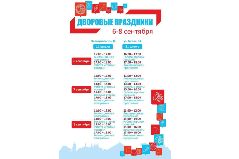 7 и 8 сентября на территории школ № 13 и № 31 пройдут праздничные мероприятия. Вас ждут веселые старты, игровые локации, интерактивные программы и многое другое.