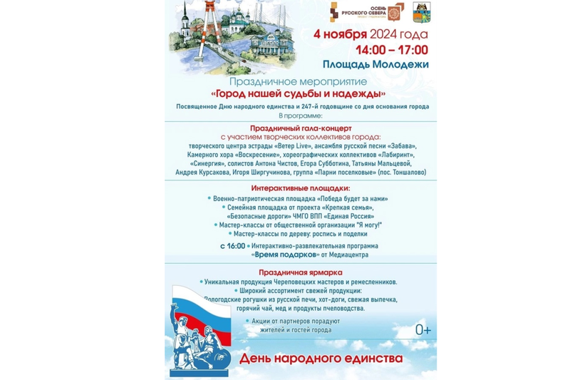 4 ноября на площади Молодежи состоится праздник «Город нашей судьбы и надежды». Череповчан ждут интерактивные площадки, ярмарка и большой концерт лучших городских солистов и коллективов.