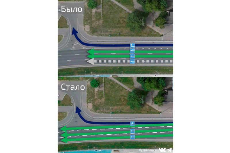 — Раньше крайняя правая полоса здесь заканчивалась перед поворотом во двор к дому № 3 и практически всегда пустовала. Для движения были доступны только две полосы, и это ограничивало пропускную способность перекрестка. Дефицит стал особенно заметен после завершения реконструкции перекрестка проспекта Победы и улицы Архангельской. Теперь крайняя правая полоса после Командарма Белова уходит на Архангельский мост. Также с нее можно повернуть и во двор, — отметил Вадим Германов.