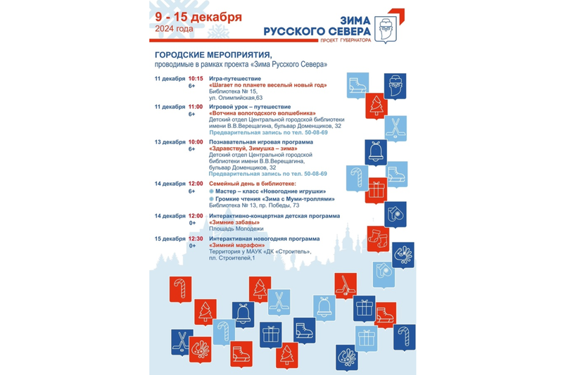 На этой неделе в рамках проекта «Зима Русского Севера» приглашаем череповчан на игру-путешествие «Шагает по планете веселый Новый год», познавательную интерактивную программу «Здравствуй, Зимушка — зима», концертно — интерактивные детские программы «Зимние забавы» и «Зимний марафон». А также советуем посетить «Семейный день в библиотеке»: изготовить новогодние игрушки и послушать стихи о зиме.