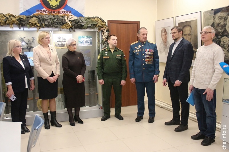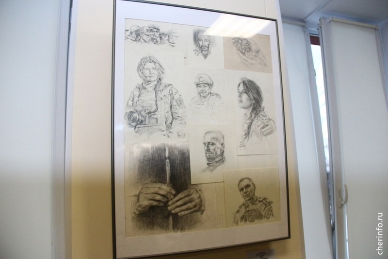 Экспозиция открылась ко Дню героев Отечества в выставочном зале Парка Победы. Череповчанам представили портреты и графические работы бойцов художника Александра Новоселова и фотографии председателя регионального отделения организации «Офицеры России» Геннадия Малышева.