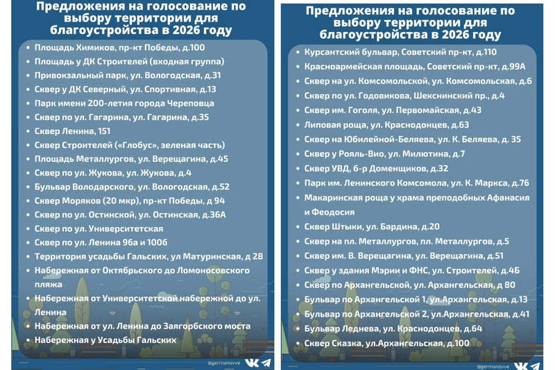 Территорию можно выбрать из сформированного списка или предложить свою, перейдя по ссылке на портал «Мой Череповец»: мойчереповец.рф/voting/che…