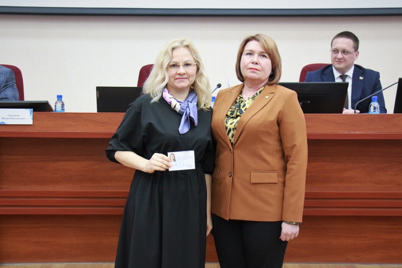 На внеочередном заседании Лина Коробейникова, председатель Территориальной избирательной комиссии Череповца, вручила временные удостоверения девяти парламентариям.