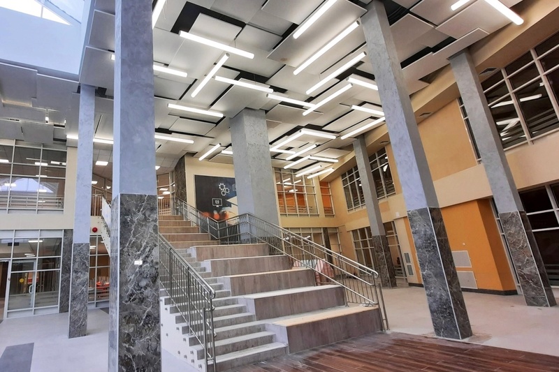 В школе оборудовано 73 кабинета, в том числе и библиотека с электронным читальным залом, медиацентр, стадион, волейбольная, баскетбольная, футбольная игровые площадки, тренажерный и гимнастический залы, актовые залы, столовая и пищеблок с современным оборудованием, медкабинеты. В каждом классе есть доски для мела и отдельно для маркеров, установлены интерактивные панели.