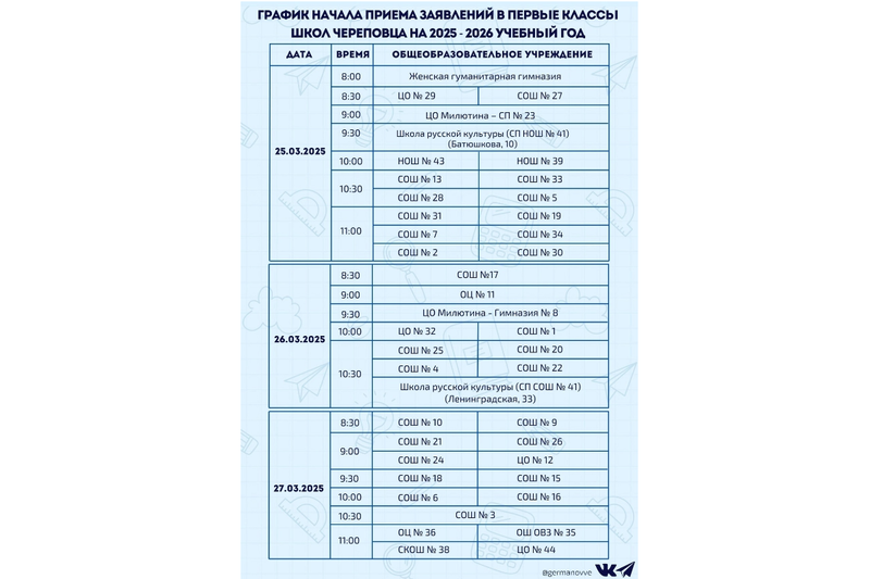 — Это на 140 детей больше, чем прошлой осенью. Приём заявлений начинается с 25 марта. Для удобства родителей и снижения нагрузки на сайт госуслуг подготовили таблицу с временем начала приема документов. Если у вас есть подтвержденный аккаунт, можно заполнить черновик заранее. Заявление также можно принести в школу лично или отправить заказным письмом.