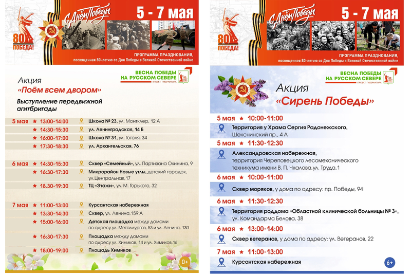 Отметим, что все мероприятие пройдут в рамках проекта Георгия Филимонова «Весна Победы на Русском Севере». Приглашаем всех жителей Череповца и гостей города принять участие в праздновании Дня Победы!