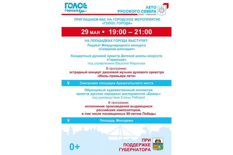 29 мая в городе стартует проект «Голос города». Завтра с 19 до 21 часа на площади Молодежи для жителей города выступят музыканты оркестра русских народных инструментов «Дождь» под руководством Елены Рябовой. В это же время на площадке у Архангельского моста своё выступление представит духовой оркестр детской школы искусств «Гармония» под управлением Василия Миронова.
