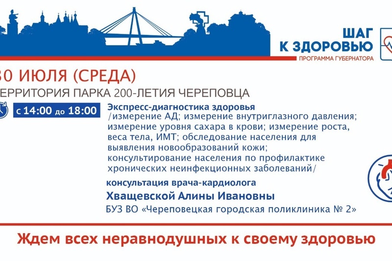 Сегодня с 14:00 до 18:00 на территории Парка 200-летия будет работать белый шатёр здоровья. Приём проведет врач-кардиолог поликлиники № 2 Хващевская Алина Ивановна.