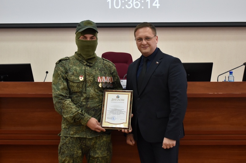 Сегодня на внеочередном заседании городской Думы отметили участника Специальной военной операции. Боец был награжден дипломом за патриотизм, самоотверженное исполнение воинского долга, преданность службе и Отечеству.