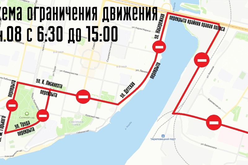 В связи с этим с 6:30 до 15:00 в Череповце будут перекрыты следующие улицы: улицы Суворова, Судостроительная, Красная, Горького на участке от Александровской набережной до Карла Либкнехта, улица Карла Либкнехта, Университетская, Детская, Набережная от проспекта Победы до Ленина, нечетная сторона Шекснинского проспекта от Южного шоссе до Рыбинской.