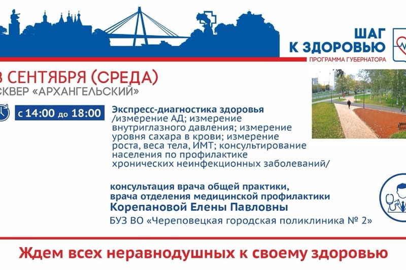 Завтра с 14:00 до 18:00 на территории сквера «Архангельский» будет работать белый шатёр здоровья. Приём проведет врач общей практики Елена Павловна Корепанова.