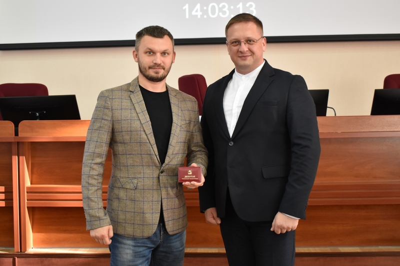 Перед началом заседания вручили значок и удостоверение депутата Роману Чижову, избранному по одномандатному округу № 2 .