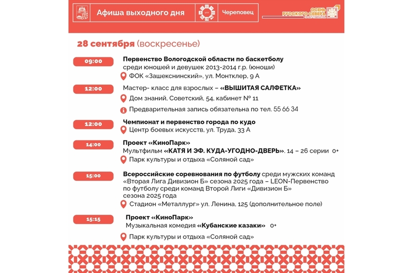 Хотите узнать обо всех мероприятиях города на выходных в одном месте? Теперь они собраны для вас в удобной афише! Уже сегодня в Череповце вас ждет 15 увлекательных событий, среди которых каждый может найти занятие по душе.