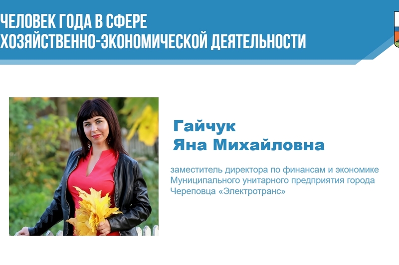 «Человек года» в сфере хозяйственно-экономической деятельности — заместитель директора по экономике и финансам МУП «Электротранс» Гайчук Яна Михайловна за принятие эффективных мер по улучшению экономического положения предприятия.