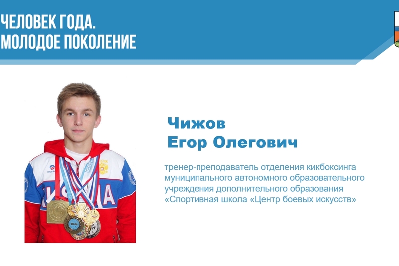 «Человек года. Молодое поколение» — тренер-преподаватель отделения кикбоксинга Центра боевых искусств Чижов Егор Олегович за личный вклад в воспитание подрастающего поколения и профессиональный подход в организации тренировочного процесса.