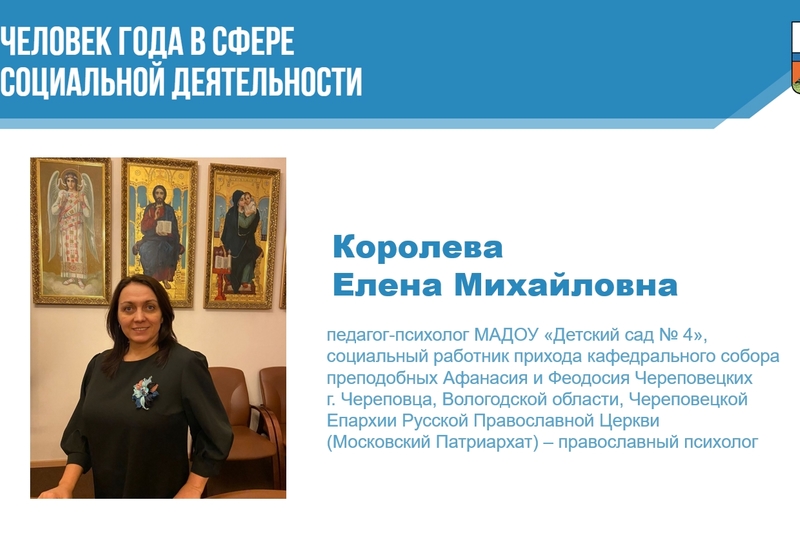 «Человек года» в сфере социальной деятельности — директор АНО поддержки семьи и детства «КАЛЕЙДОСКОП», педагог-психолог Королева Елена Михайловна за реализацию социальных коррекционно-развивающих программ и проектов.