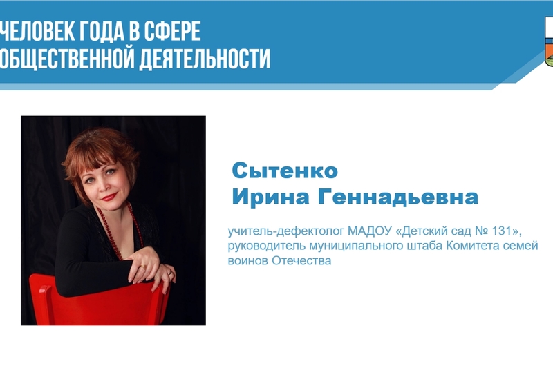 «Человек года» в сфере общественной деятельности — руководитель муниципального штаба Комитета семей воинов Отечества Сытенко Ирина Геннадьевна за организацию помощи участникам СВО и их семьям.