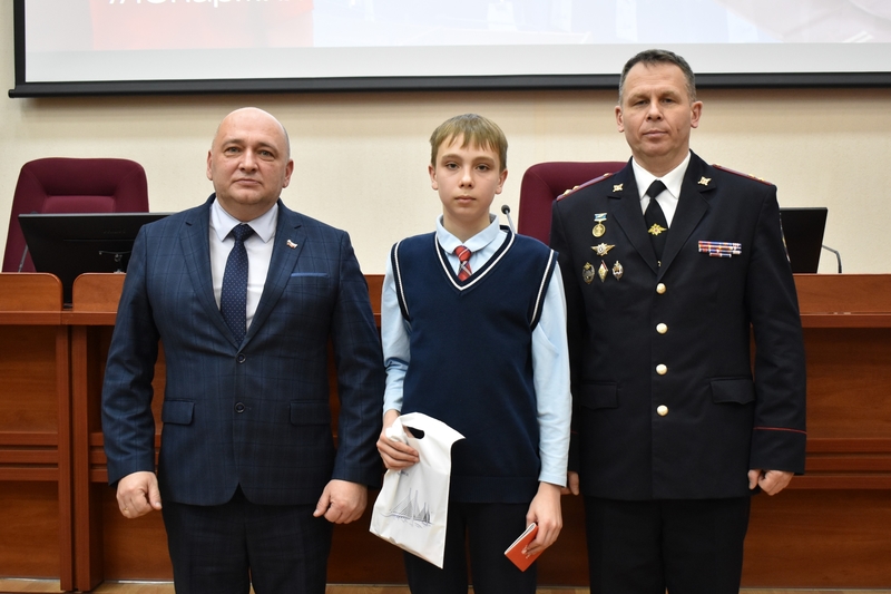 Поздравили ребят, а также вручили подарки от администрации Череповца начальник УМВД России по городу Череповцу, полковник полиции Артем Суманеев и председатель Гордумы Илья Ивашов.