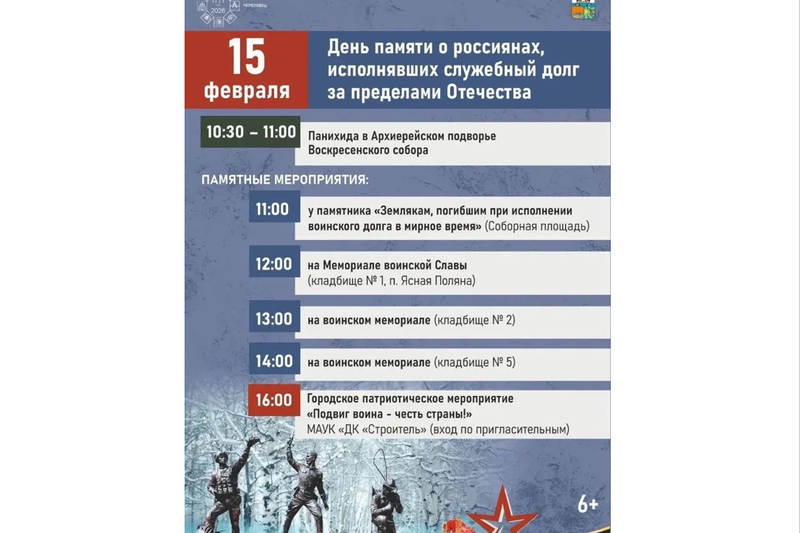 15 февраля мы вспоминаем тех, кто исполнял служебный долг за пределами Отечества. Памятные мероприятия о воинах-интернационалистах пройдут на нескольких городских площадках.