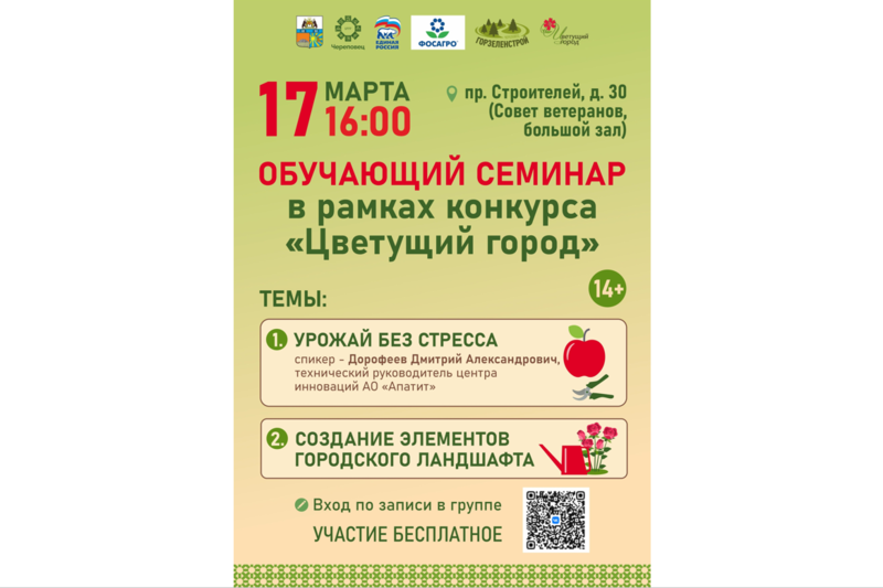 Уже завтра, 17 марта, в 16:00 состоится семинар по ландшафтному дизайну в преддверии старта городского конкурса «Цветущий город». Всех желающих в здании Совета ветеранов на пр. Строителей, 30 будет ждать два образовательных блока: